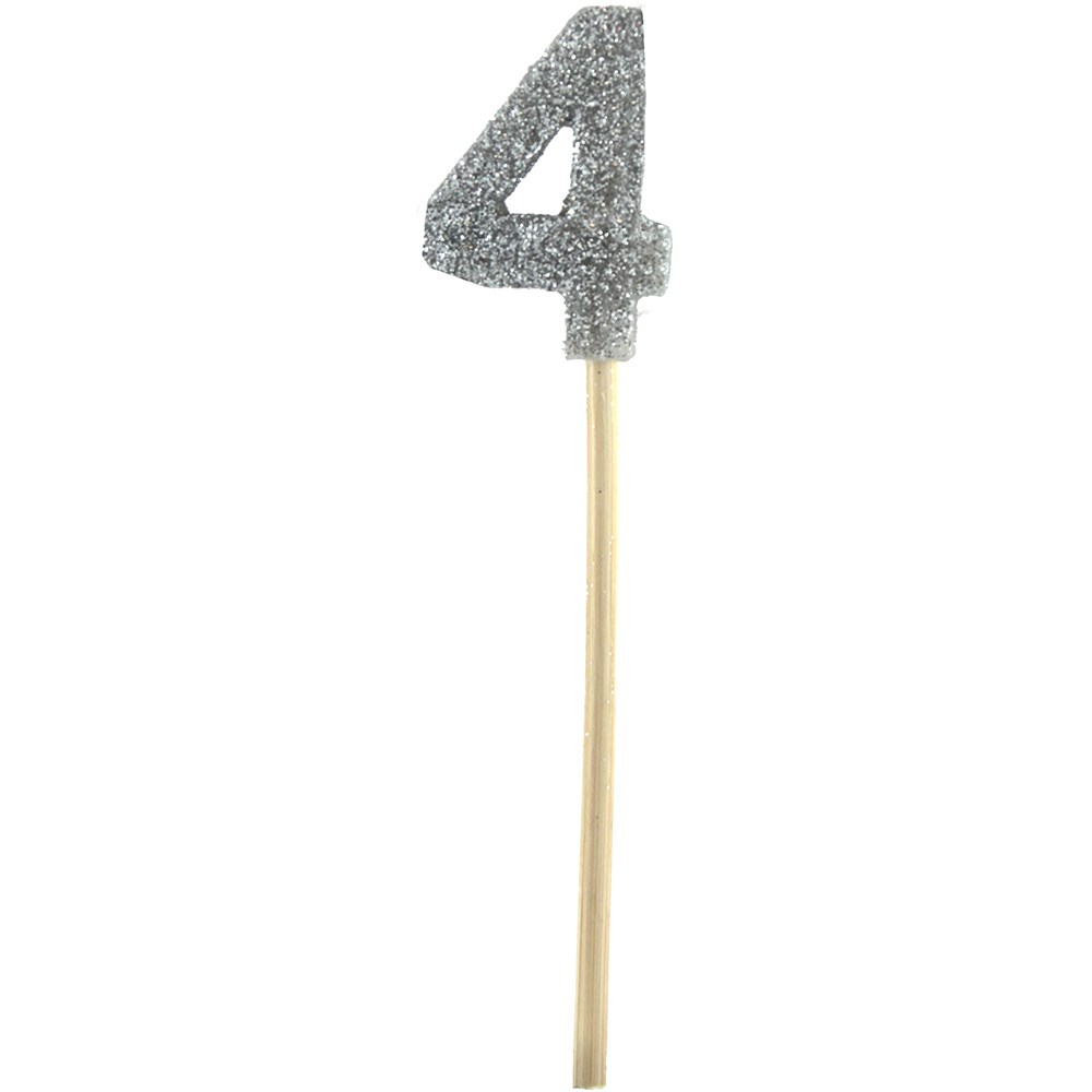 4cm high candle covered in silver glitter, on a 16cm bamboo stick.