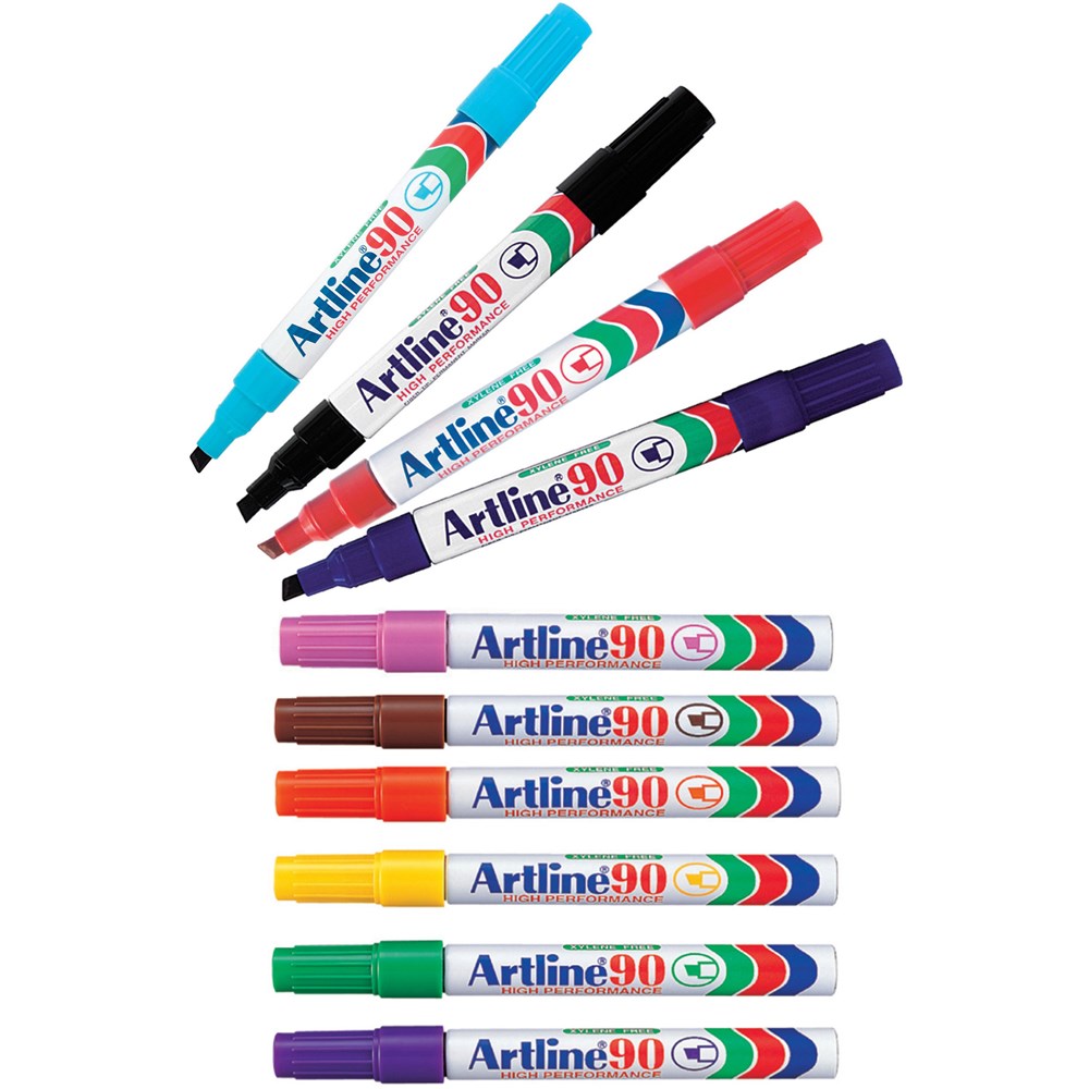 Artline 90 Permanent Markers Chisel 2-5mm Assorted Colours Box Of 12