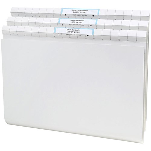 Suitable for upright filing in file cabinets, file cabinet drawers and shelving.