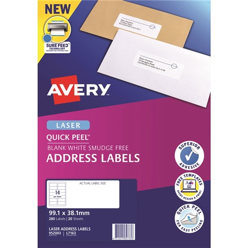 Avery Quick Peel Address Laser Labels White L7163 99.1x38.1mm 14 UP 280 Labels 20 Sheets