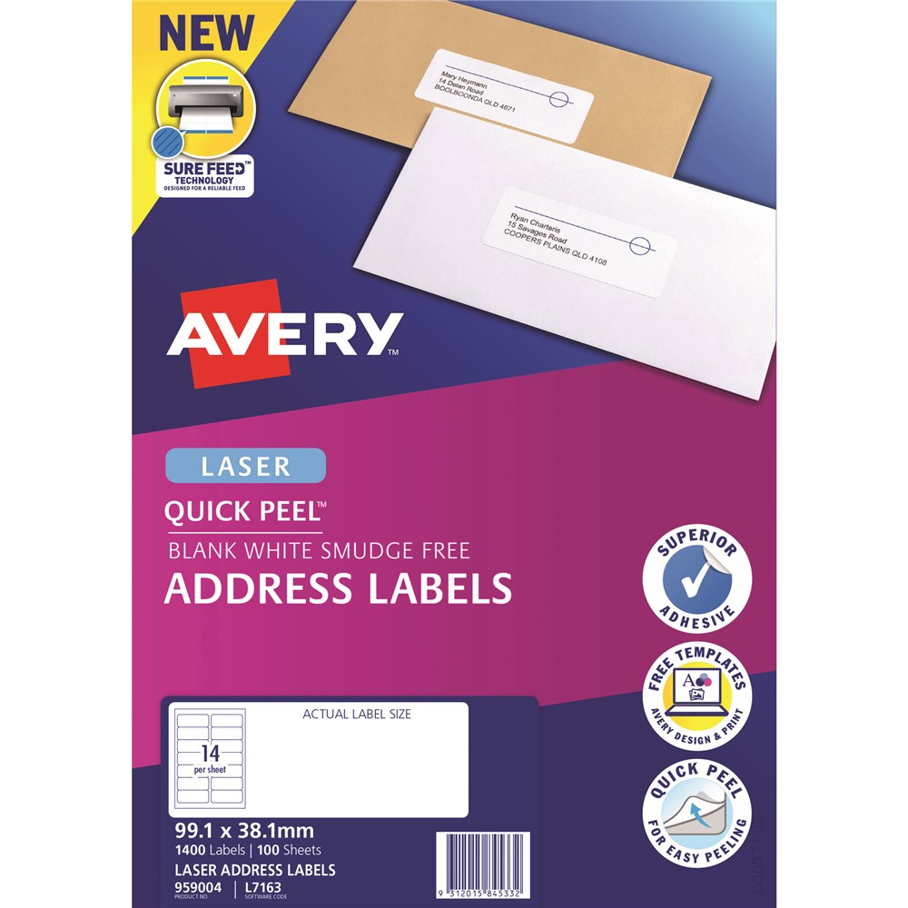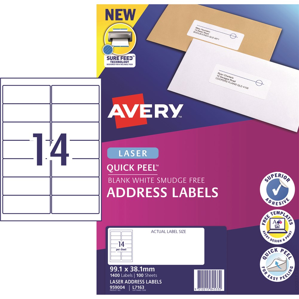 Avery Quick Peel Address Laser Labels White L7163 99.1x38.1mm 14 UP 280 Labels 20 Sheets