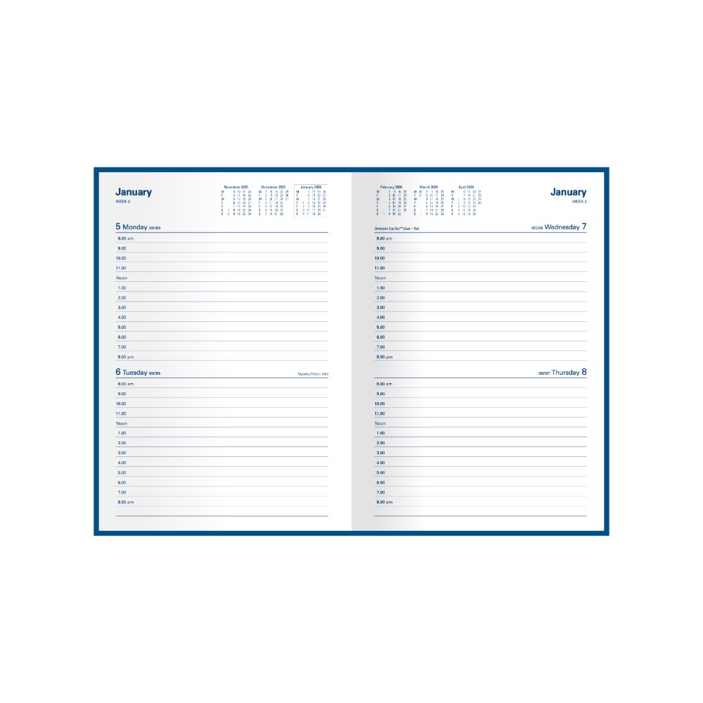 Lay flat opening, ribbon marker, 2 days to a page layout.