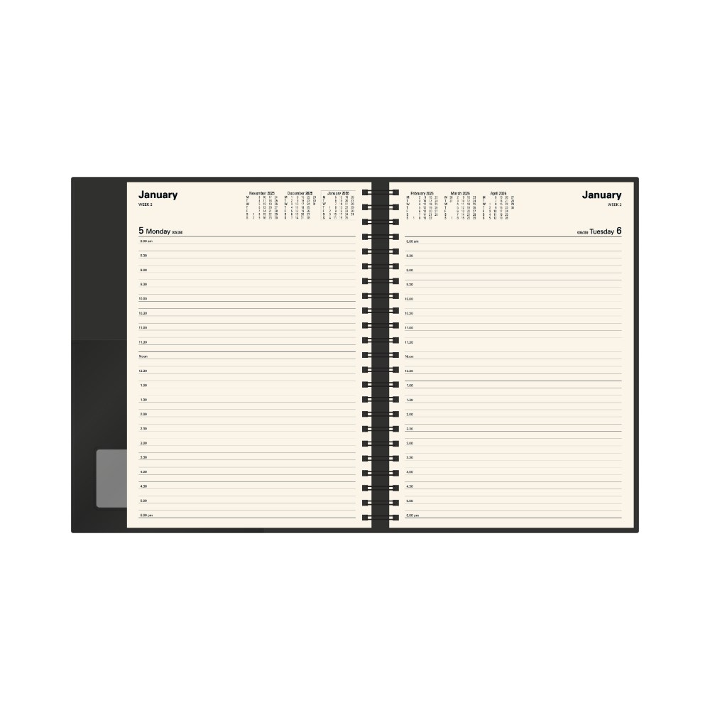 Printed on a subtle cream paper, each dated page layout features a six-month to opening calendar, week numbers, Julian days, as well as both national and international public holidays.
