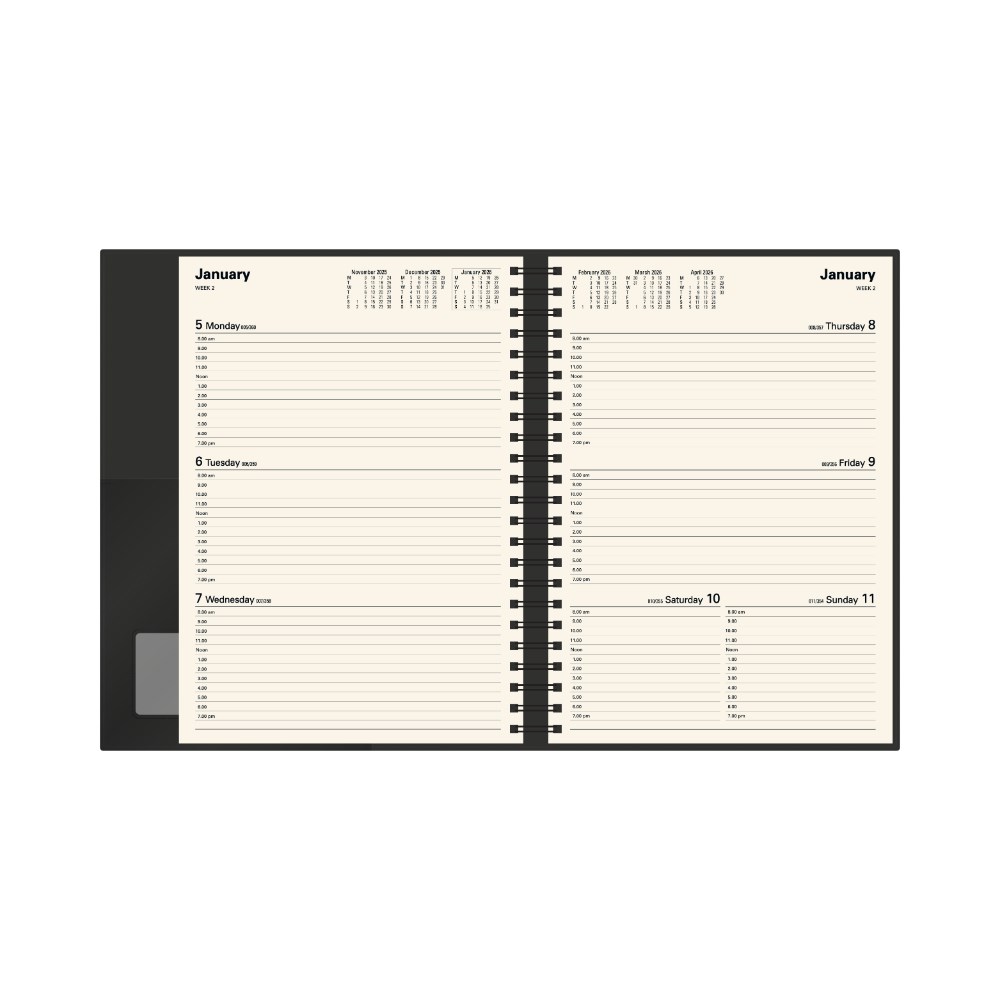 Pen loop, lay flat opening, ribbon marker and week to view layout.