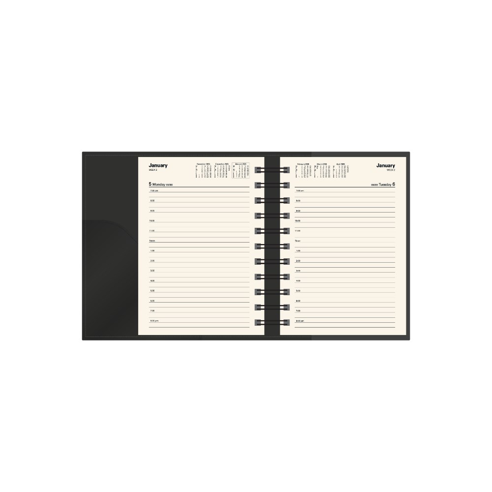 Internal storage pocket, addresses and notes. Pen loop, lay flat opening, ribbon marker, day to page layout.