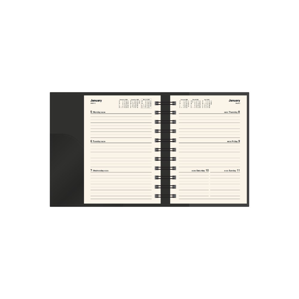 Pen loop, lay flat opening, ribbon marker and week to view layout.