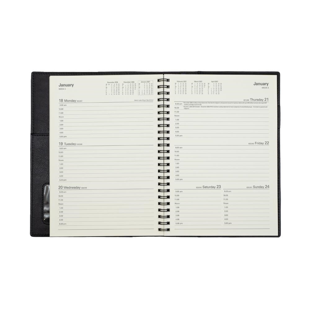 Ideal for those 'on the move' with its double wiro binding and heavily grained metallic and matt PU cover.