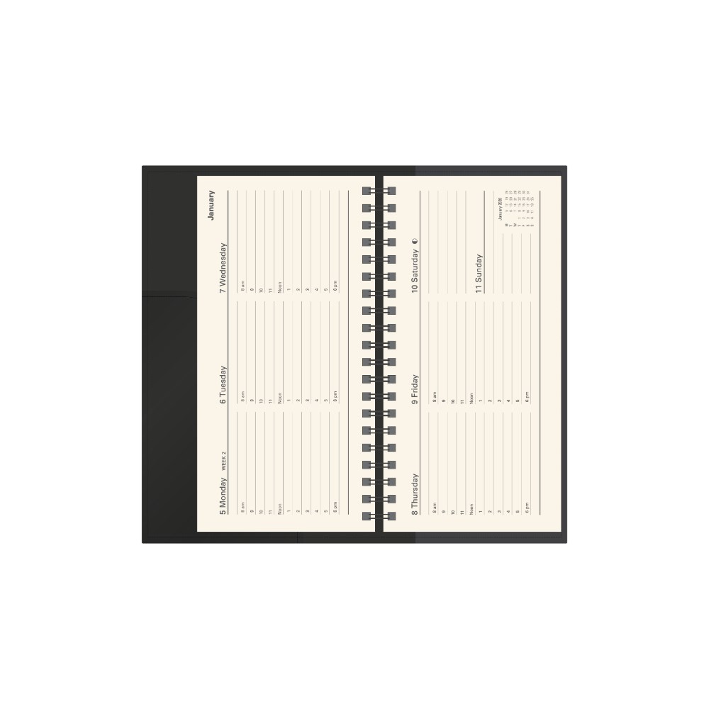Printed on a subtle cream paper, each dated page layout features a six-month to opening calendar, week numbers, Julian days, as well as both national and international public holidays.