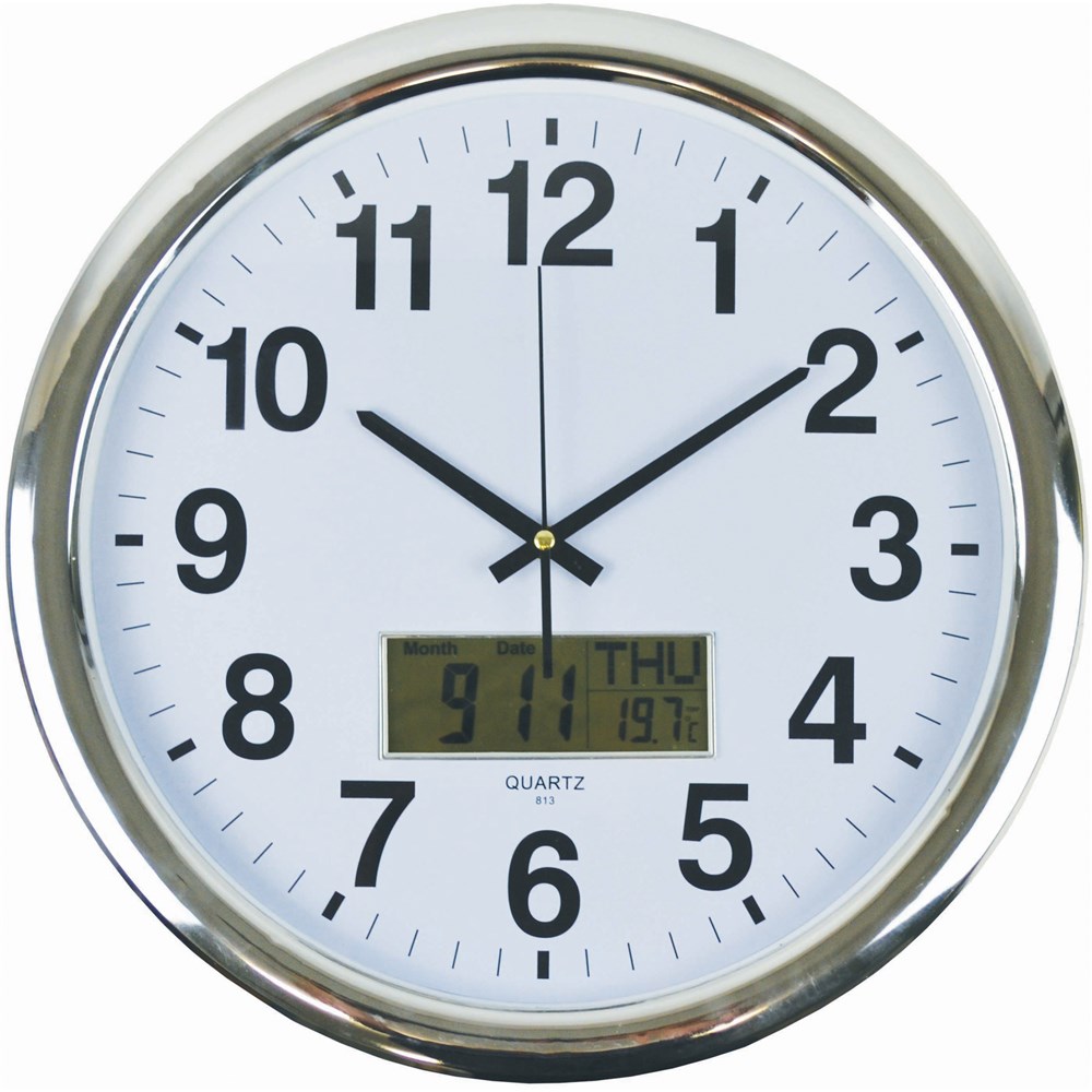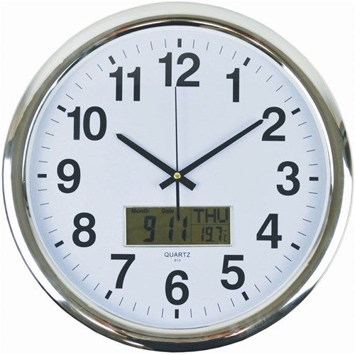 Italplast Wall Clock Inset LCD Date Month Temperature 43cm Round Chrome Frame White Face