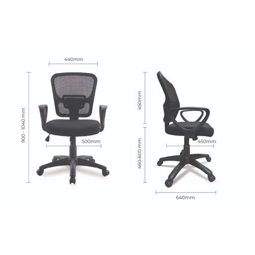 Seat Dimensions: 500W x 450D x 460-600mmH. Back Height: 450mm. Back Width: 440mm. Floor to Arms: 640-730mm.