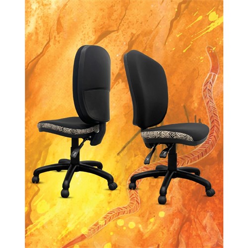 A unique commercial fabrics designed by Nelly Patterson (Indigenous Artist) combined with K2 Black Fabric to upholster the chair.