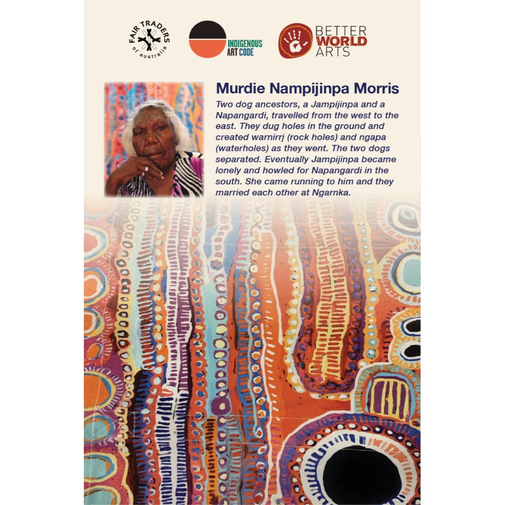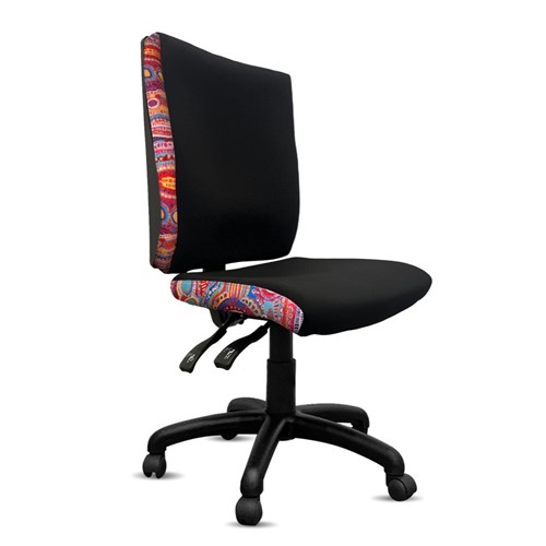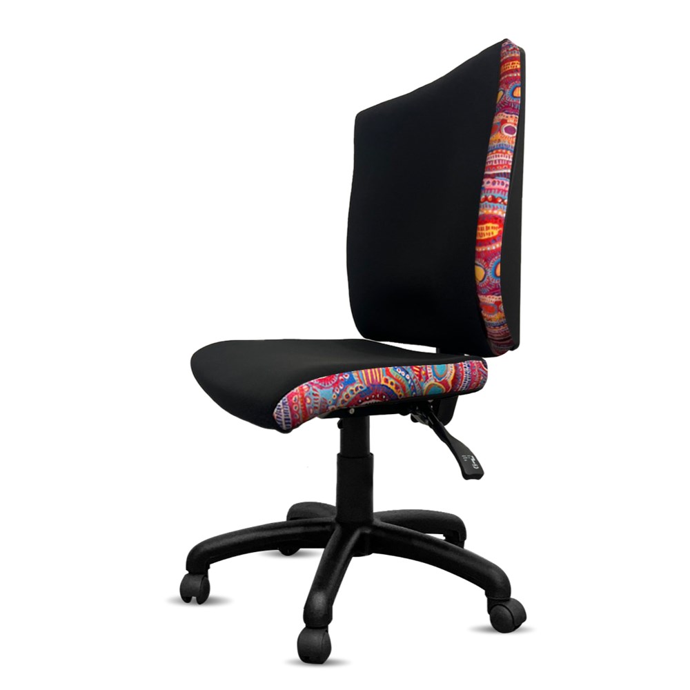 A unique commercial fabrics designed by Murdie Nampijinpa Morris (Indigenous Artist) combined with K2 Black Fabric to upholster the chair.