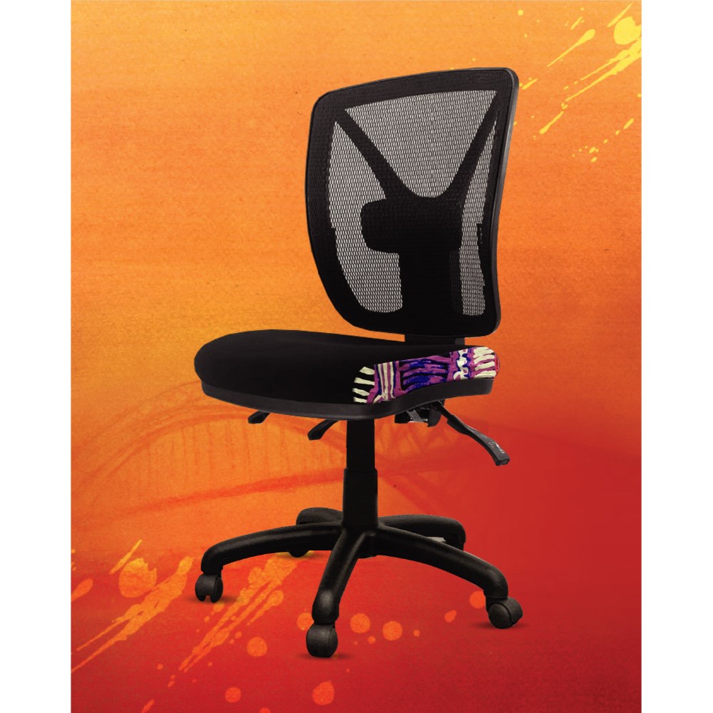 A unique commercial fabrics designed by Murdie Nampijinpa Morris (Indigenous Artist) combined with K2 Black Fabric to upholster the chair.