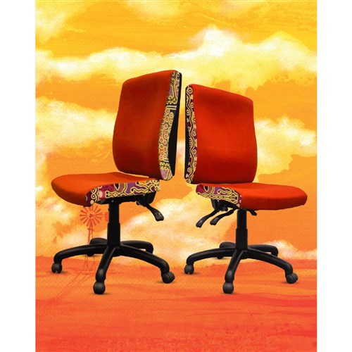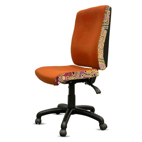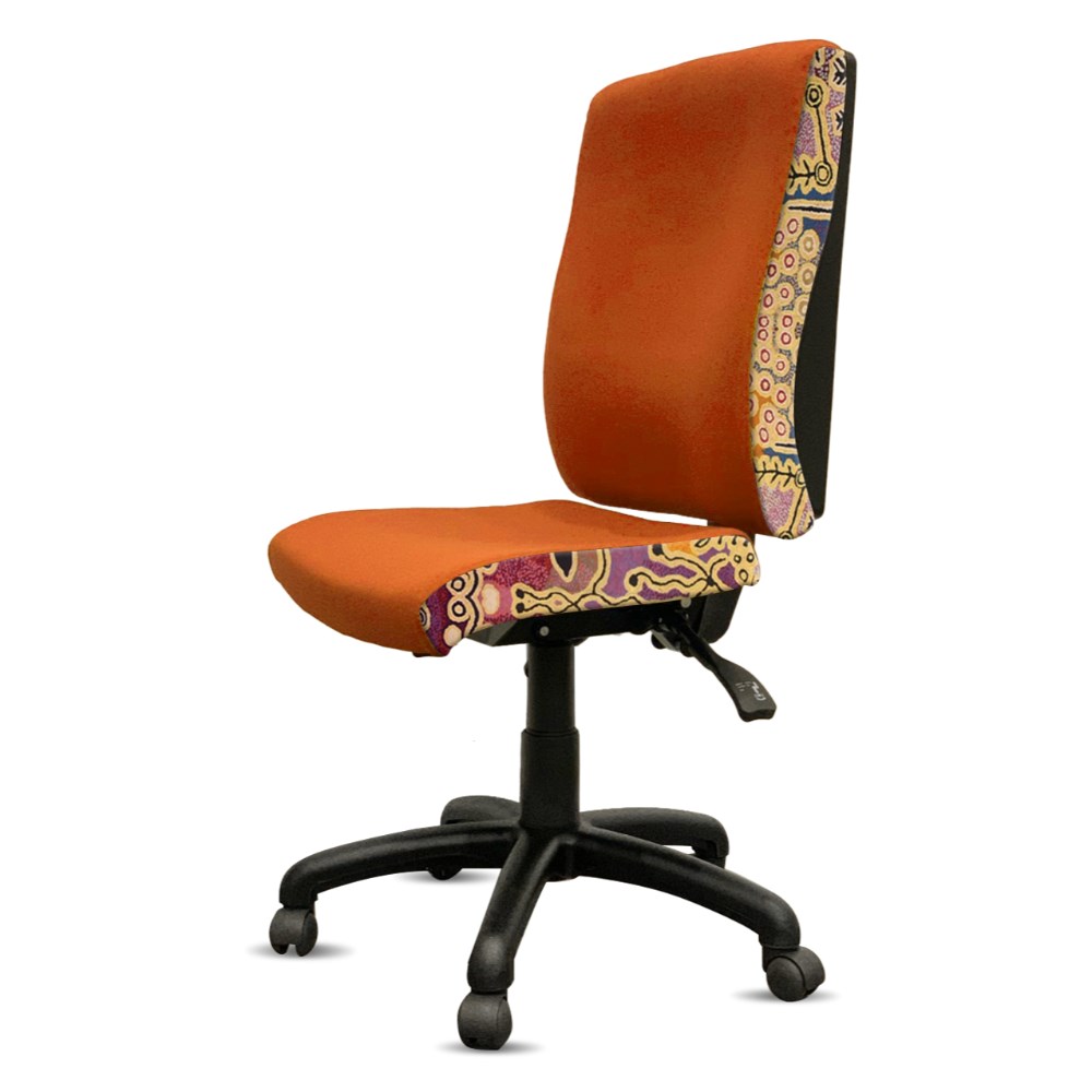 A unique commercial fabrics designed by Paddy Stewart (Indigenous artist) combined with K2 Golden Orange Fabric to upholster the chair.
