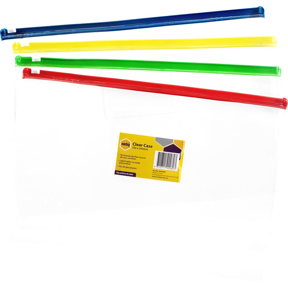 Marbig Clear Case A4 335 x 245mm With Coloured Zip Assorted