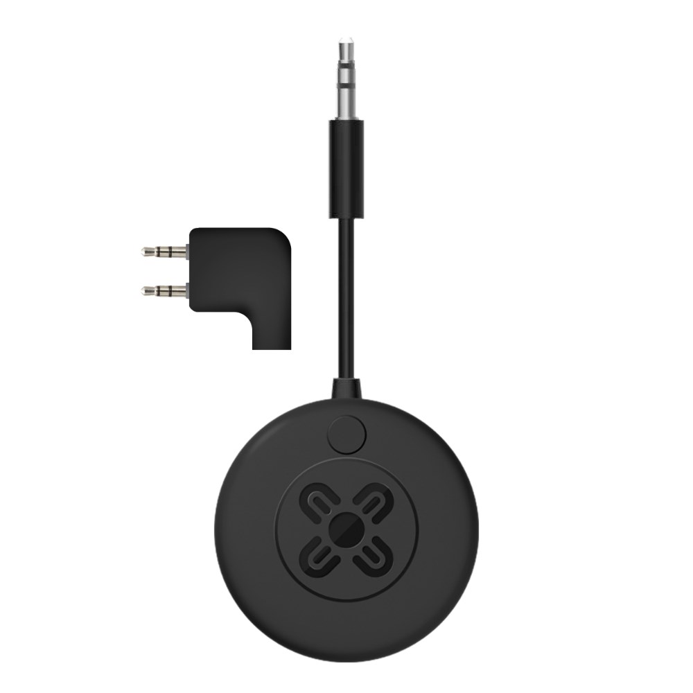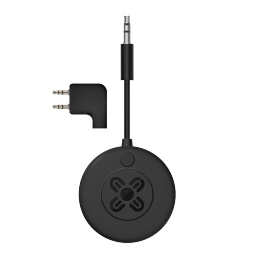 The included 2-pin airline adaptor connects directly to seatback screens, converting the wired audio output into a wireless signal.