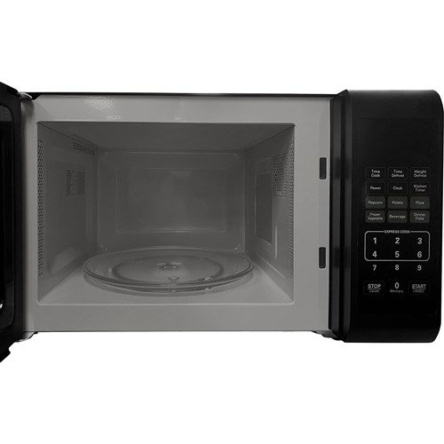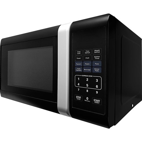 Easy clean black conventional 23L microwave with LED display and grey interior, speedy one touch cooking and incremental power settings.