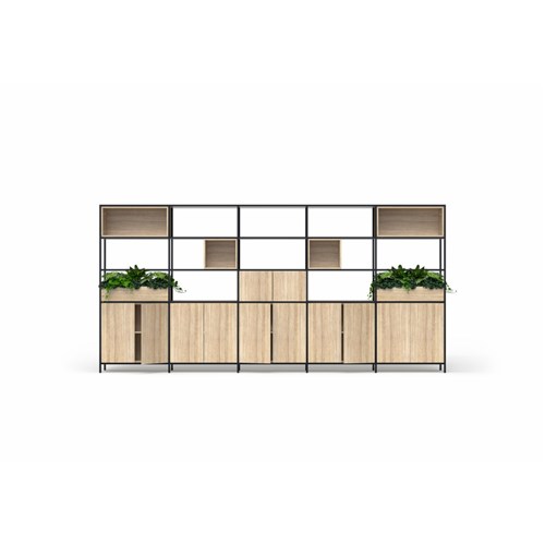 Minimalistic design to liven up wall spaces. Configurable to custom fit any space, meeting diverse storage needs through multiple storage options including cubbies and cabinets.