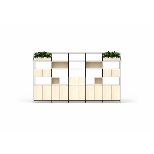Includes: End frame 2400 (2 pack), middle frame (2 x 2 pack), rails (10 pack x 6), shelves (5 pack x 6), small cubby x 2, full cupboard x 2, full cupboard x 5, small cupboard x 3 and planter box x 2. Plants not included.