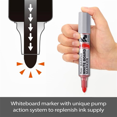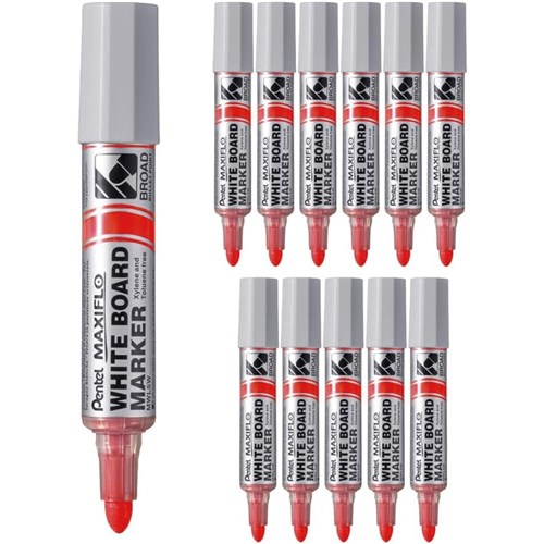 Pentel MWL5W Maxiflo Whiteboard Marker Broad Bullet 8.0mm Pump It Red Box Of 12