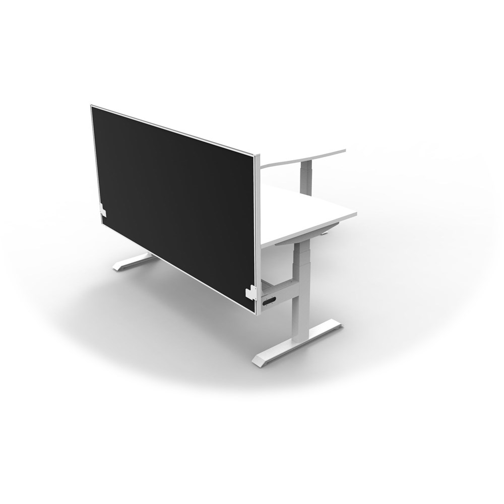 Includes pinnable privacy screen in black fabric with matching white powder coated frame. 900mm H x 30mm T.