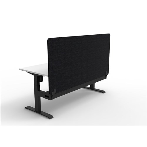 Electric height adjustable single sided workstation with Natural White top and Black Satin frame, Black Eco screen and cable tray.