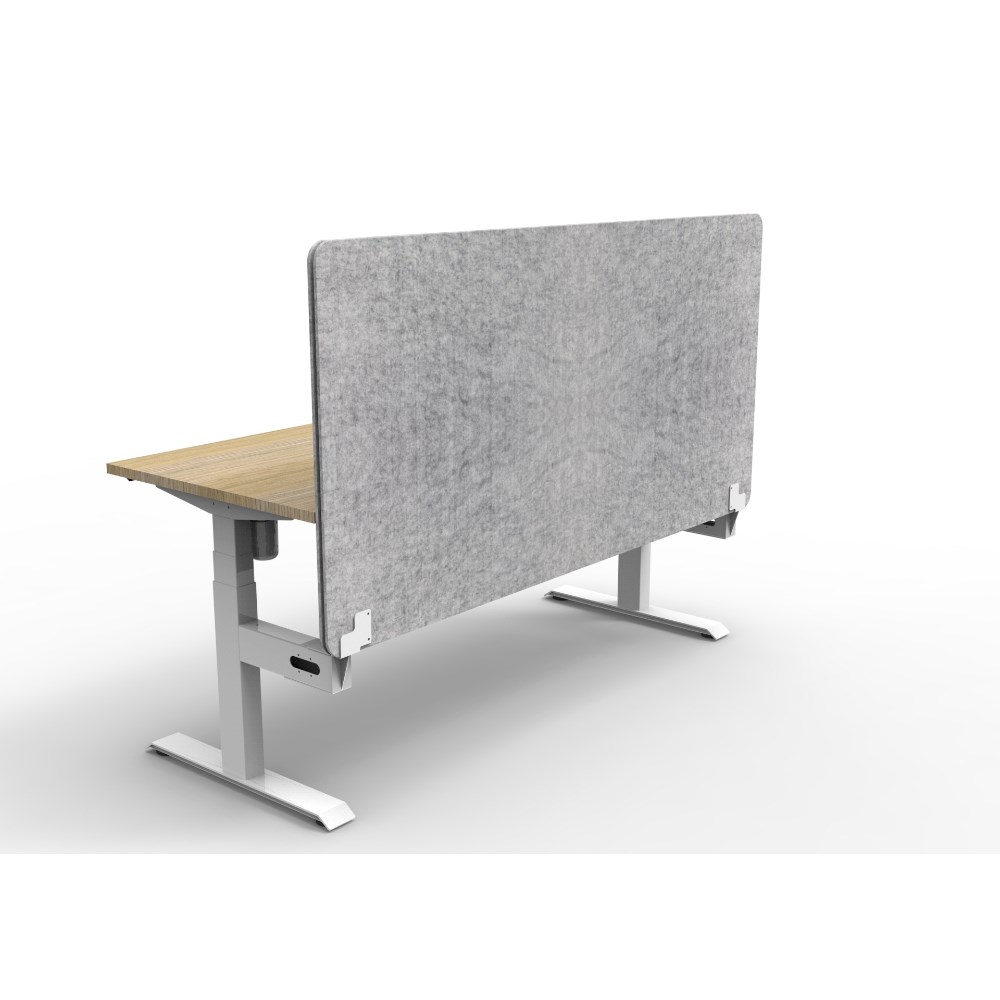 Electric height adjustable single sided workstation with Natural Oak top and White Satin frame, Grey Eco screen.