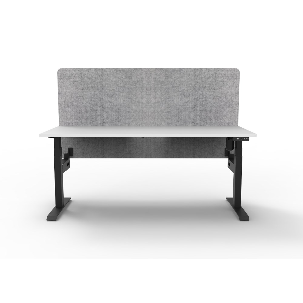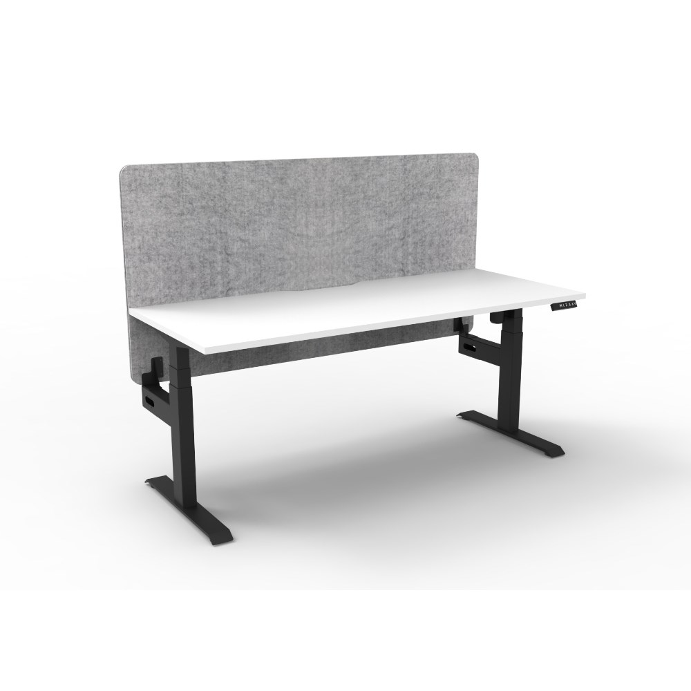Electric height adjustable single sided workstation with Natural White top and Black Satin frame, Grey Eco screen.