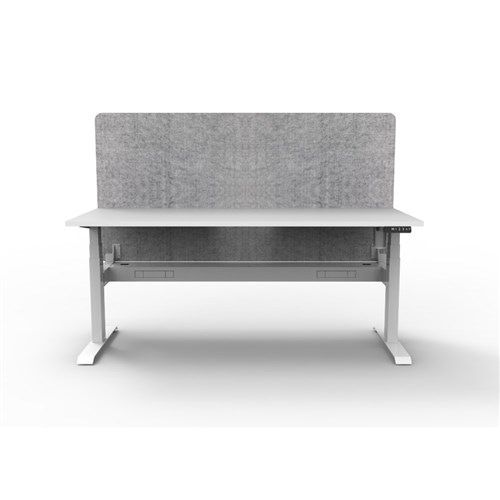Electric height adjustable single sided workstation with Natural White top and White Satin frame, Grey Eco screen and cable tray.