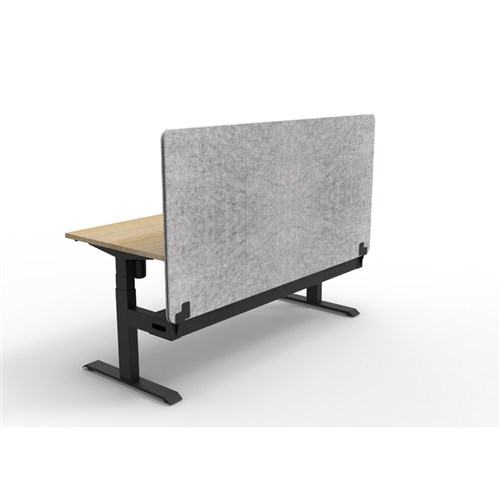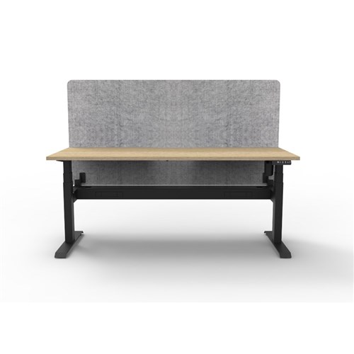 Electric height adjustable single sided workstation with Natural Oak top and Black Satin frame, Grey Eco screen and cable tray.
