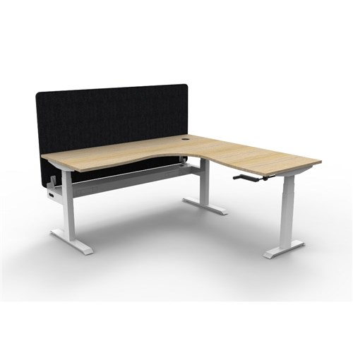 Manual crank height adjustable corner workstation with Natural Oak top and White Satin frame, Black Eco screen and cable tray.