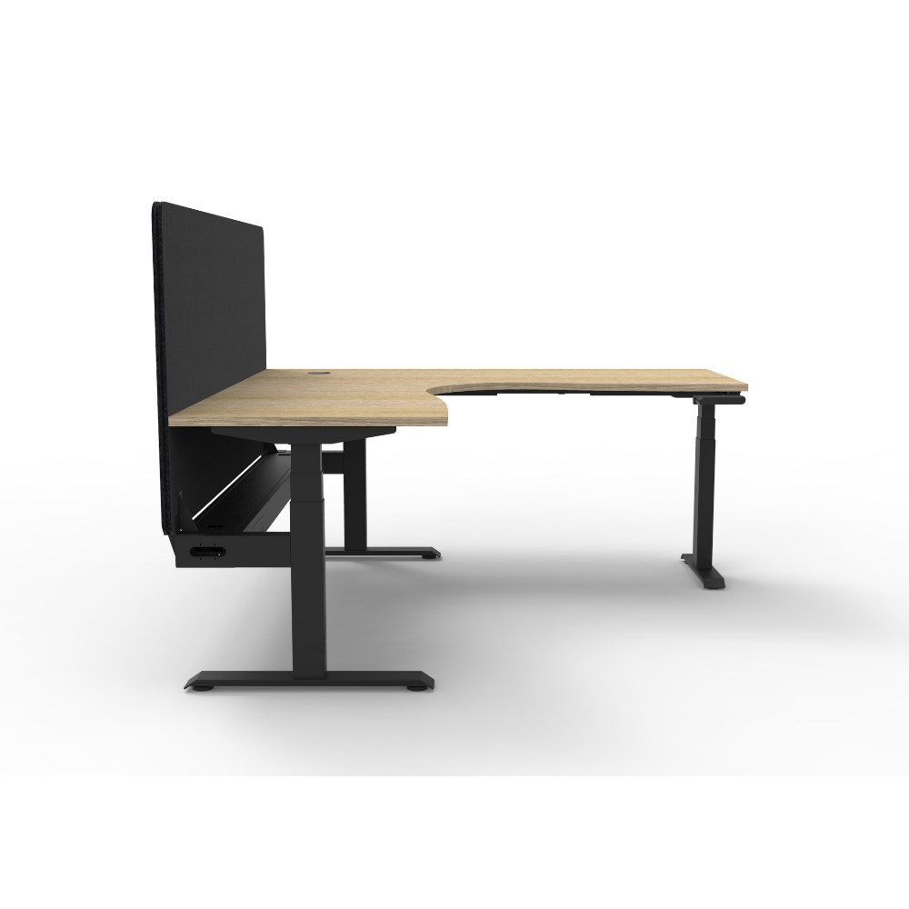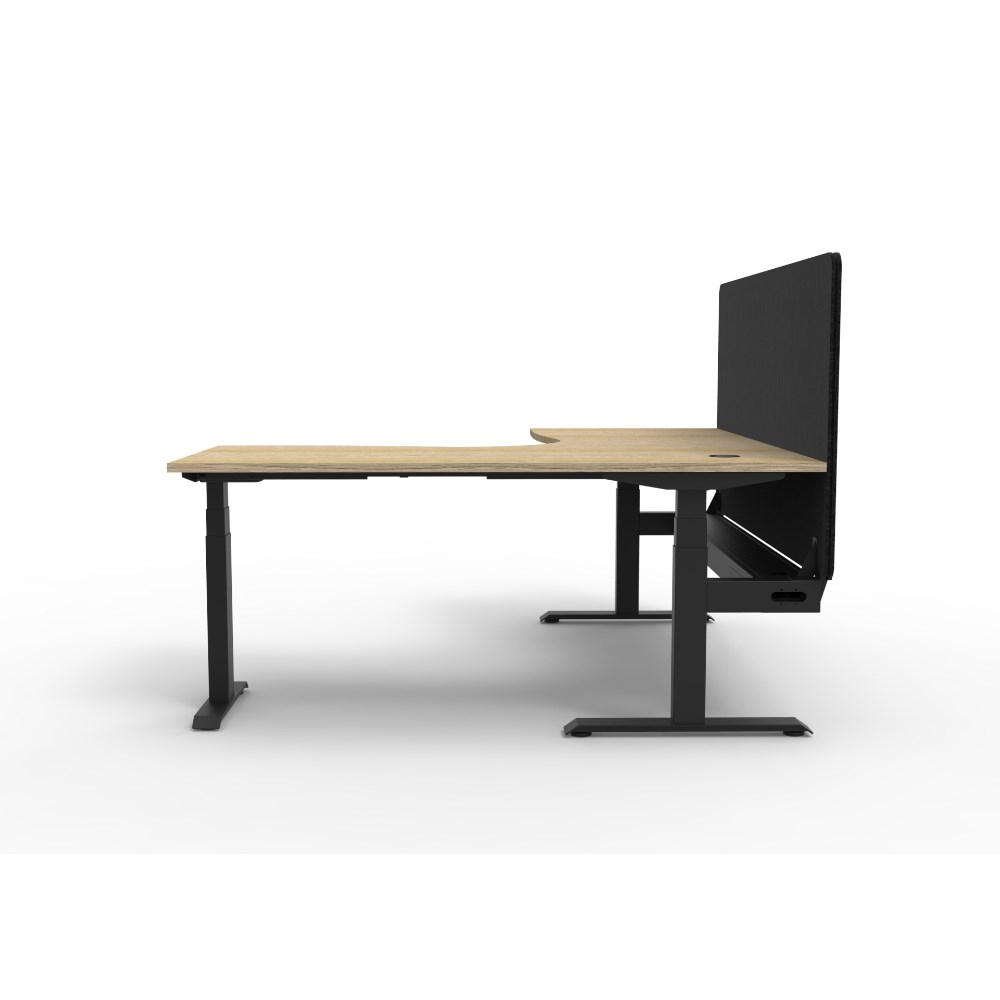 Manual crank height adjustable corner workstation with Natural Oak top and Black Satin frame, Black Eco screen and cable tray.