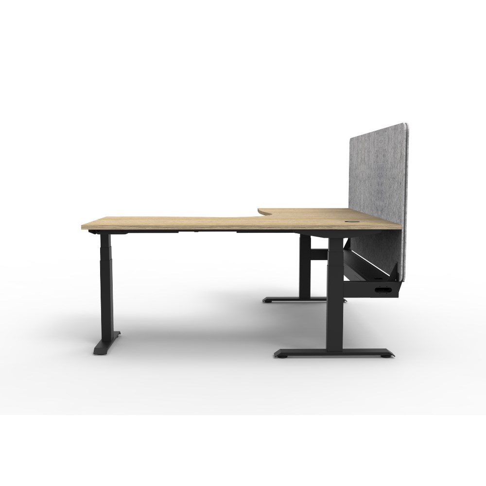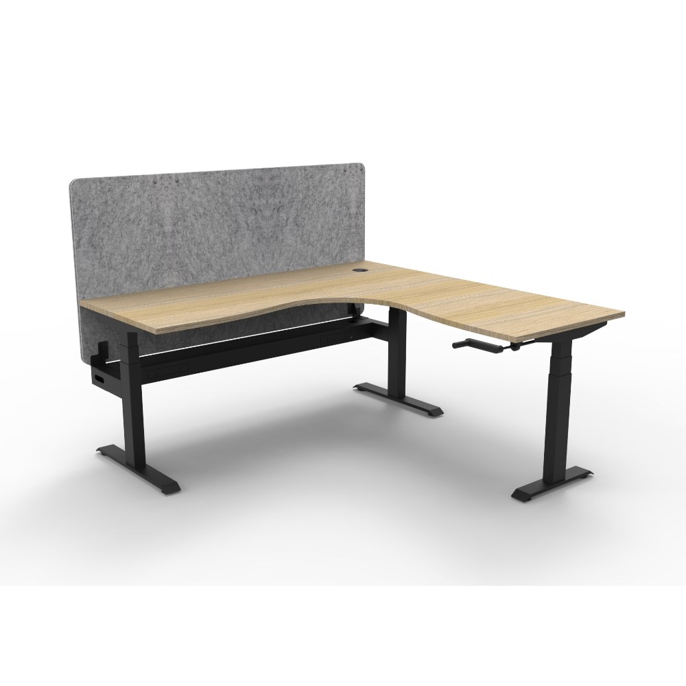 Manual crank height adjustable corner workstation with Natural Oak top and Black Satin frame, Grey Eco screen and cable tray.