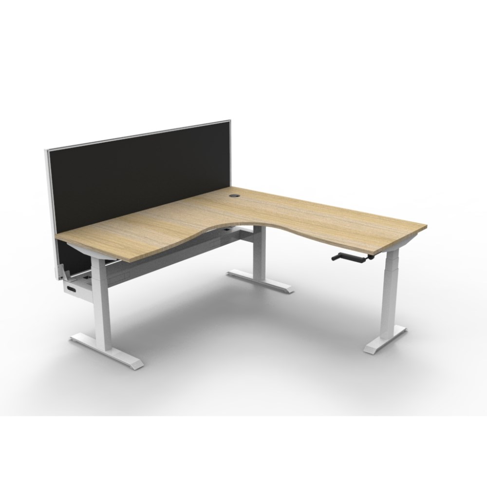 Rapidline Boost manual crank height adjustable corner workstation with cable tray and screen. Natural oak top with white frame.