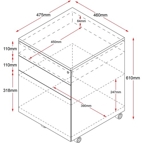 Drawer Dimensions: Top: 390W x 475D x 65mmH. File: 390W x 475D x 250mmH.