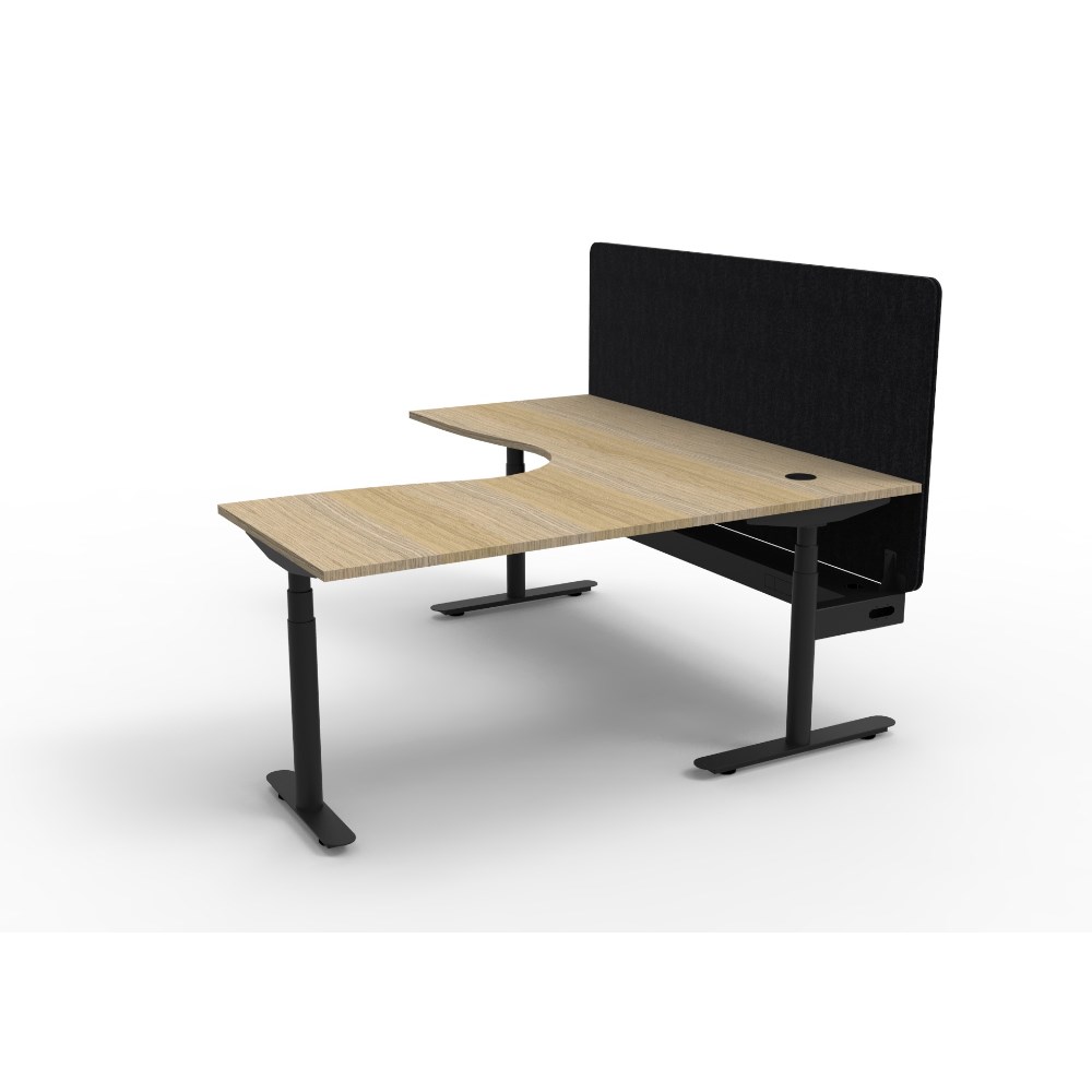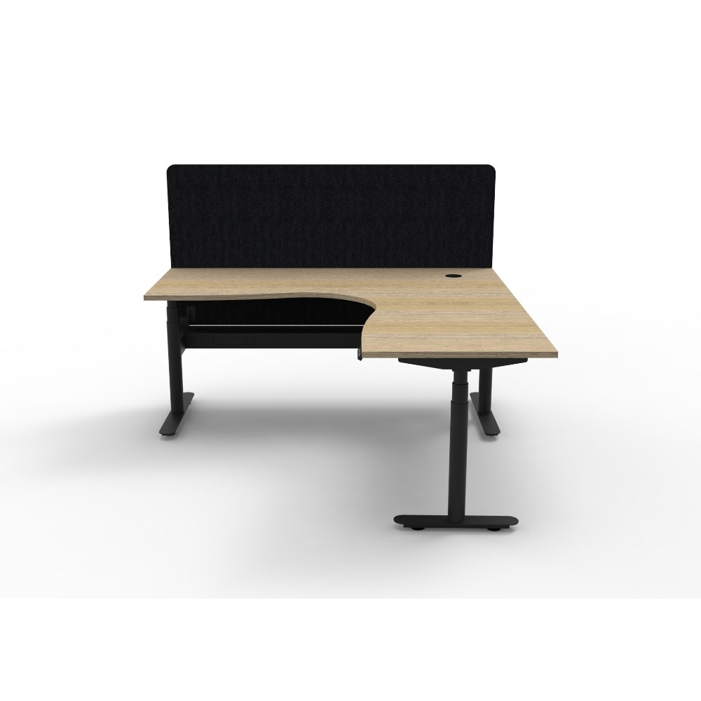 Electric height adjustable corner workstation with Natural Oak top and Black Satin frame, Black Eco screen and cable tray.