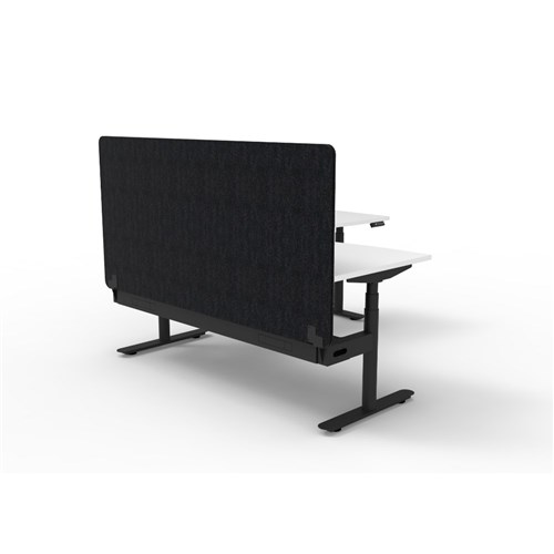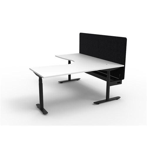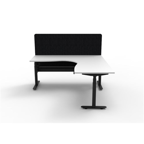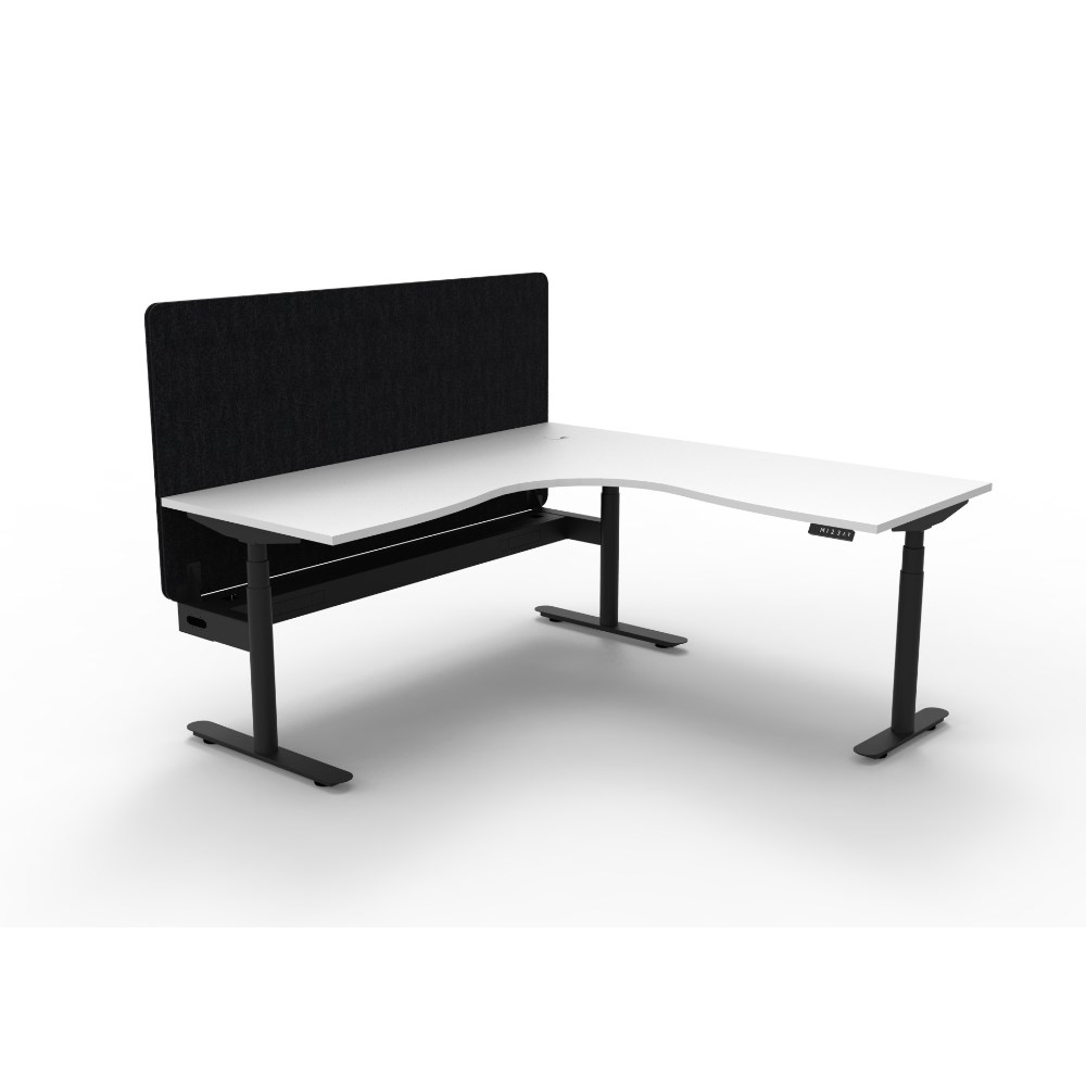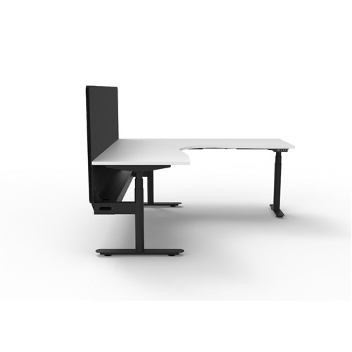 Electric height adjustable corner workstation with Natural White top and Black Satin frame, Black Eco screen and cable tray.