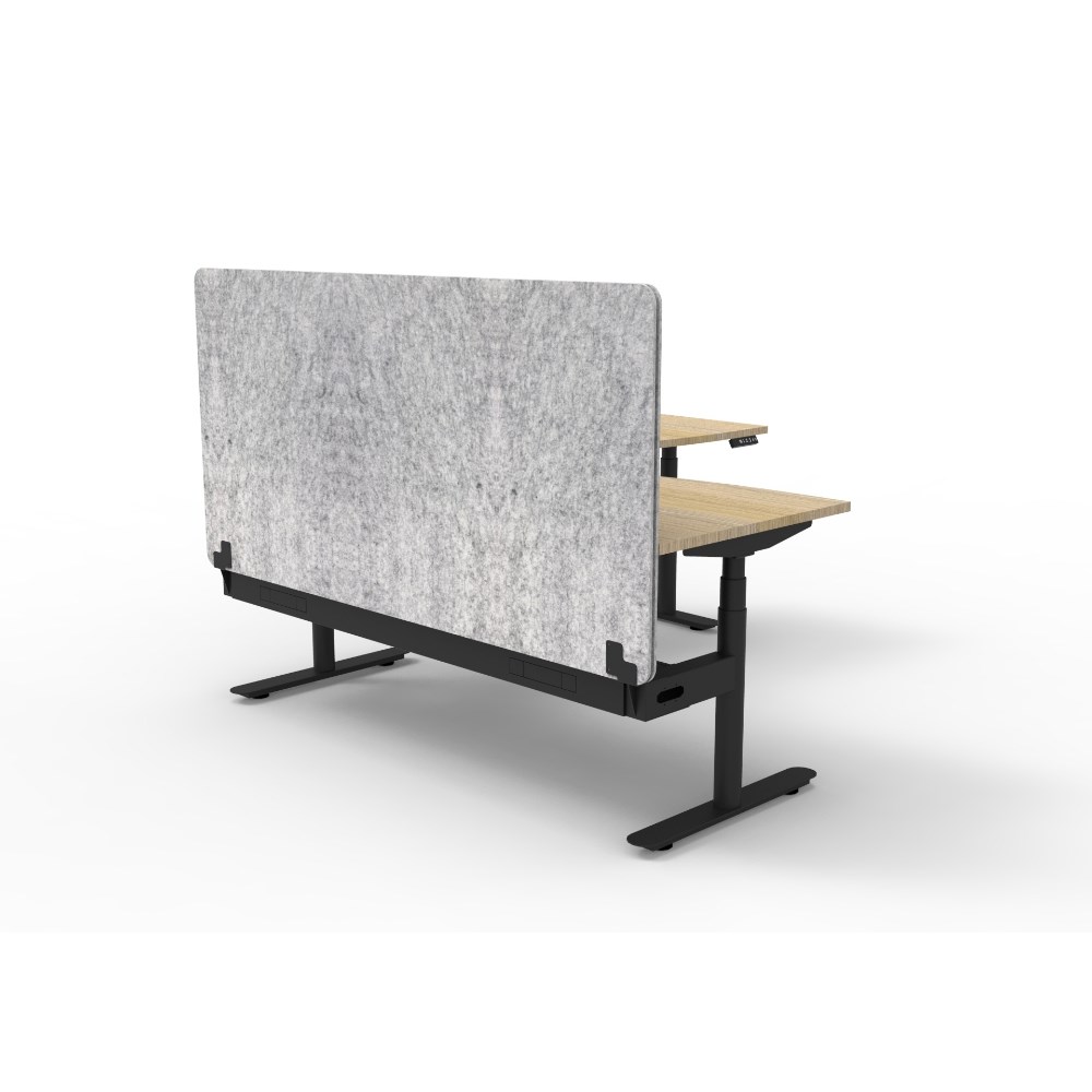 Electric height adjustable corner workstation with Natural Oak top and Black Satin frame, Grey Eco screen and cable tray.