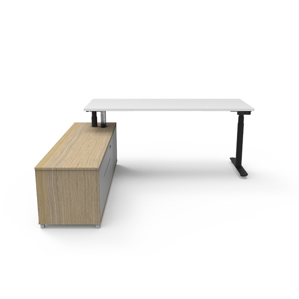 Natural White top and Black Satin frame. Height adjustable desk with left hand side cabinet.