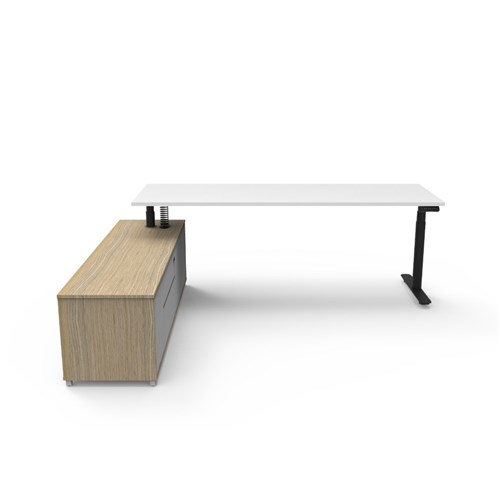 Natural White top and Black Satin frame. Height adjustable desk with left hand side cabinet.