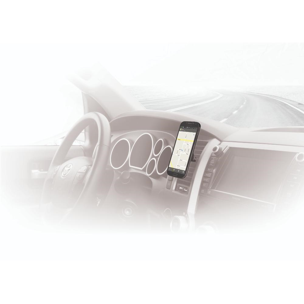 Safely, quickly secure mobile devices to any vehicle vent type: horizontal, vertical, angled or circular.