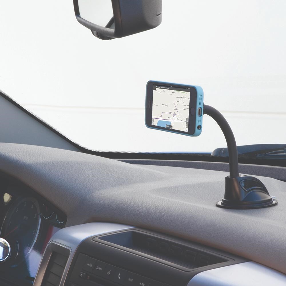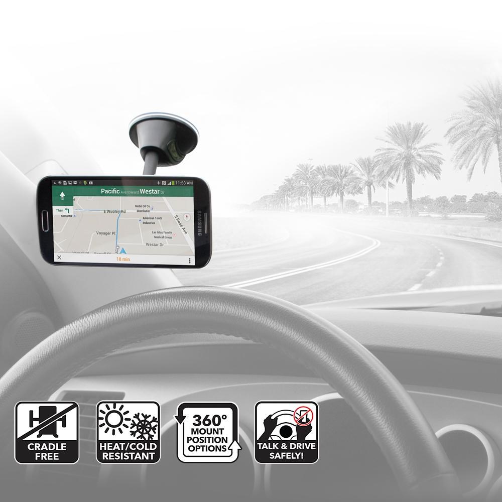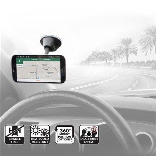 Suction cup attaches securely to dashboard or window surfaces.