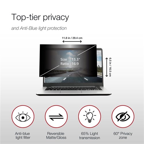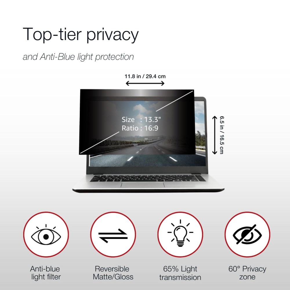 Privacy, blue light reduction and anti-glare technology.
