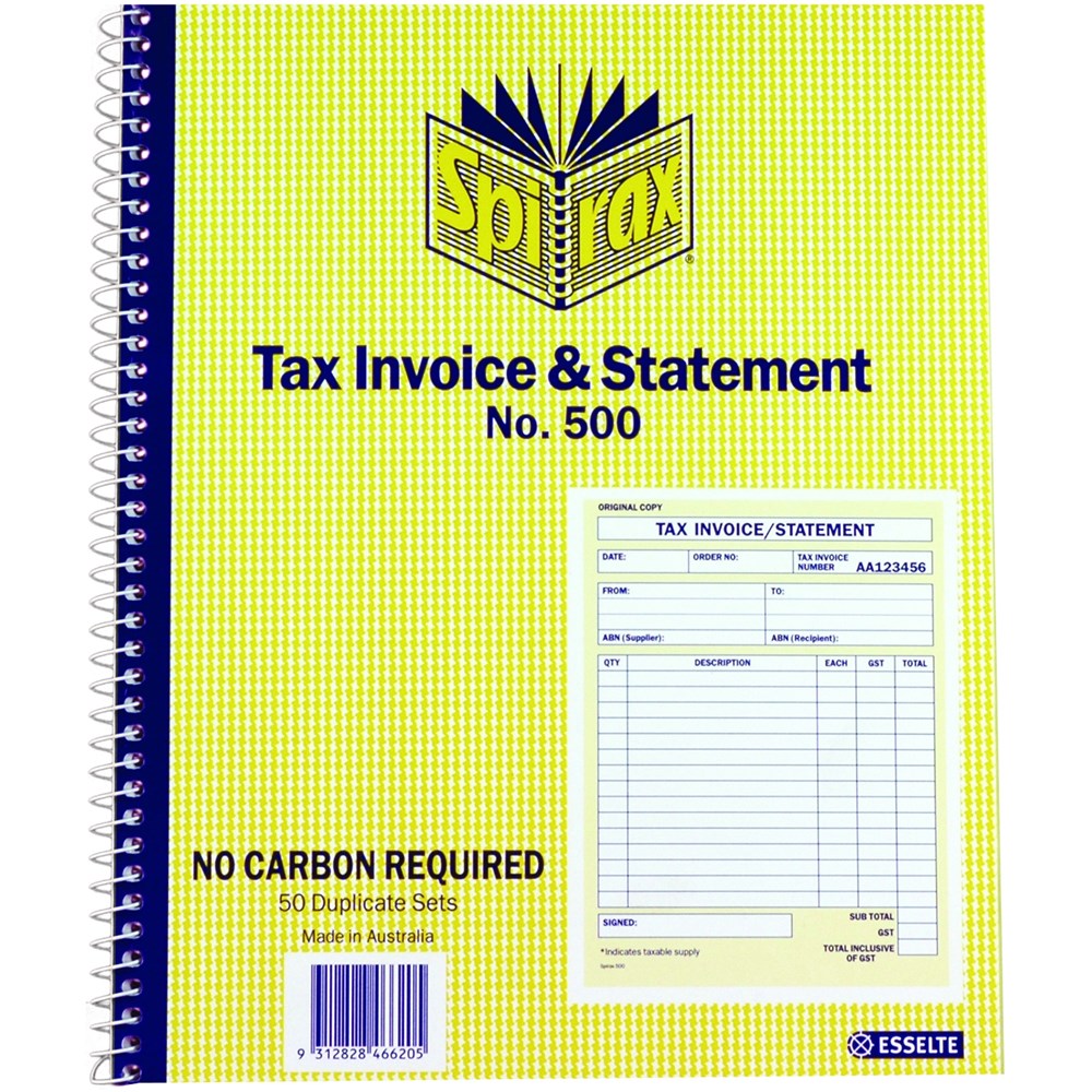 Spirax 500 Tax Invoice & Statement Book Carbonless Quarto 50 Duplicate Sets S/O