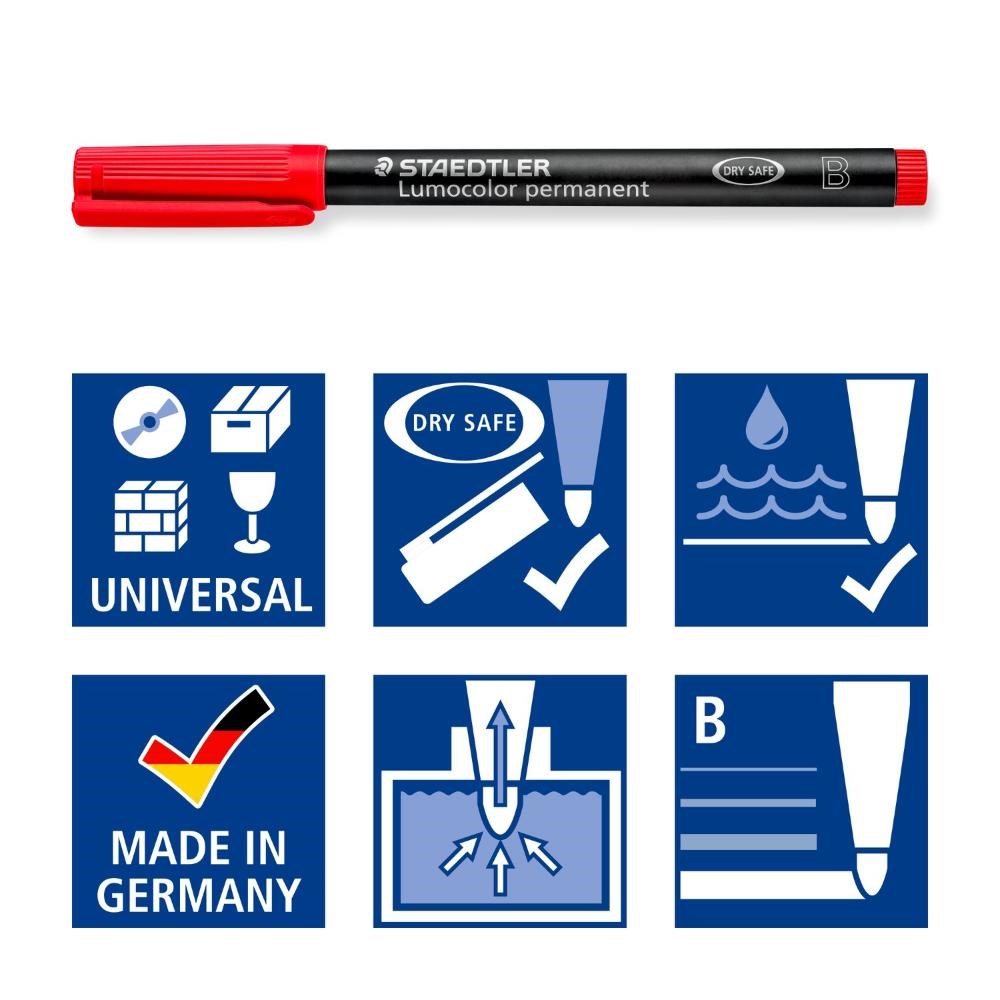 Excellent smudge-proof and waterproof qualities on almost all surfaces. Dries in seconds, therefore ideal for left-handed users.