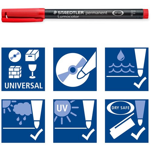 Ideal for writing on smooth and glossy surfaces such as film, glass, ceramic, plastic, metal, paper, courier bags, wood, fabric or CDs, DVDs & OHPs.
