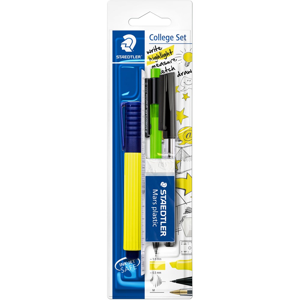 The College set contains: 1x Textsurfer® classic highlighter, 1x Mars® plastic eraser, 1x Stick 430 ballpen, 1x 15 cm ruler & 1x graphite 777 mechanical pencil.