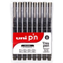 Uni Pin 200 Fineliner Drawing Pens Assorted Tip Sizes Black Wallet of 8