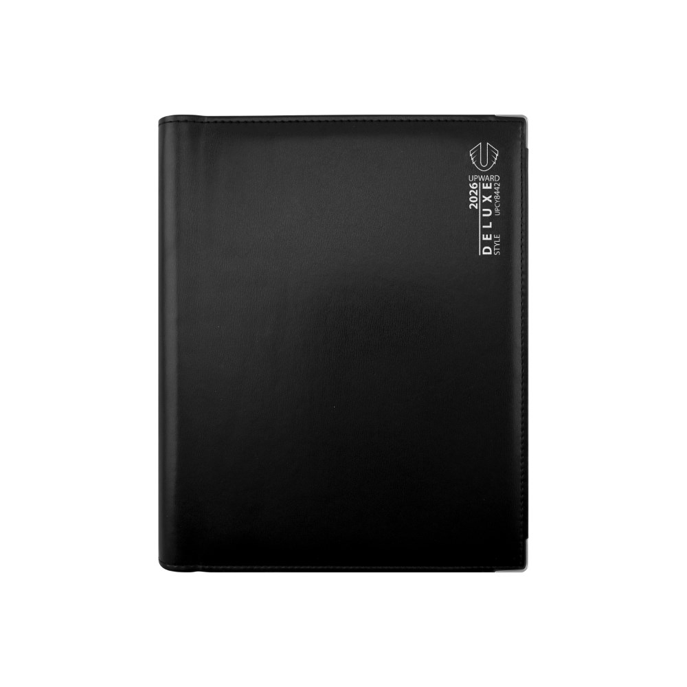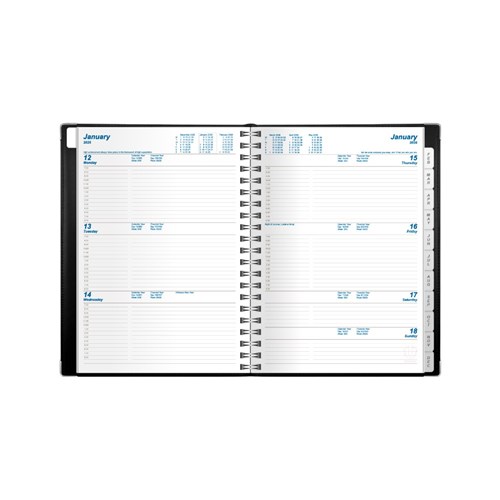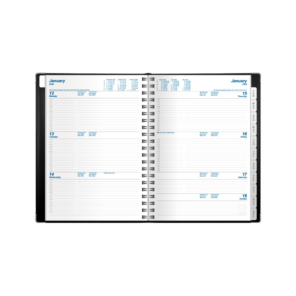 Double wire binding. Lay flat opening. Ribbon marker. Tabs. Translucent pocket.