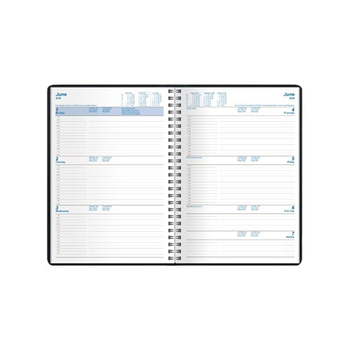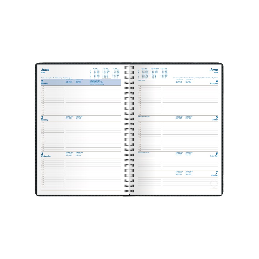 Featuring a padded, phthalate free, PVC cover, pockets for storing business cards and wire-o binding to allow the diary to lie completely flat when open.